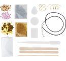 Żywica ma krystalicznie czystą powierzchnię i dlatego jest idealna do tworzenia unikalnej biżuterii. Proszę zostać projektantem z tym zestawem! Dołączony brokat w różnych kolorach, urocze kwiaty i małe rozsypane kawałki w różnych kształtach można posypać według własnego uznania. Dzięki temu mogą Państwo ciągle tworzyć nowe, niepowtarzalne elementy. Dzięki załączonym instrukcjom wykonanie jest łatwe. Każdy element jest wyjątkowy!