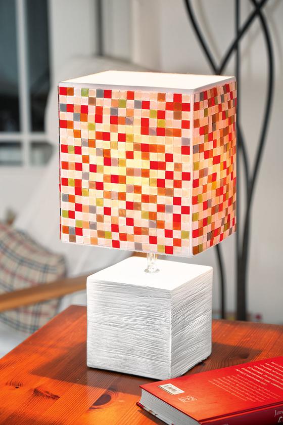 Przyklej mozaikę do abażuru za pomocą kleju z efektem. Klej z efektem ma tę zaletę, że schnie przezroczysto. Zwróć uwagę na prowadzenie krawędzi. Możesz użyć pęsety, aby pomóc w jej dokładnym umieszczeniu. Następnie zmontuj lampę.