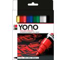 Zestaw markerów Marabu YONO "BASIC 3" zawiera kolory: Żółty, wiśniowy, ciemnoniebieski, soczyście zielony, biały i czarny.