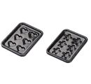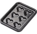 Szczegółowy zestaw miniaturowych foremek do pieczenia o długości ok. 4 cm i szerokości ok. 3 cm. Metalowe foremki do pieczenia mają ok. 0,5 cm wysokości. Zestaw zawiera dwie foremki z uroczymi serduszkami i małymi piernikowymi ludzikami.