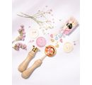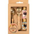 Otrzymają Państwo dwa słoiczki z 54 kolorami wosku do pieczętowania, każdy w kolorze białym/różowym i złotym/jasnoniebieskim. Dołączona łyżka do topienia pozwala na łatwą aplikację, a stempel z drewnianym uchwytem i dwa motywy pieczęci - napis i serce - pozwalają na personalizację.