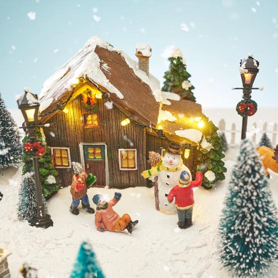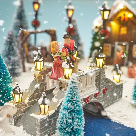 Gdy dekoracyjny śnieg wyschnie, a figurki będą stabilnie osadzone, możesz dodać kolejne dekoracyjne akcenty. Nałóż dekoracyjny śnieg na latarnie, most i dachy miniaturowego krajobrazu, aby nadać im zimowy charakter.