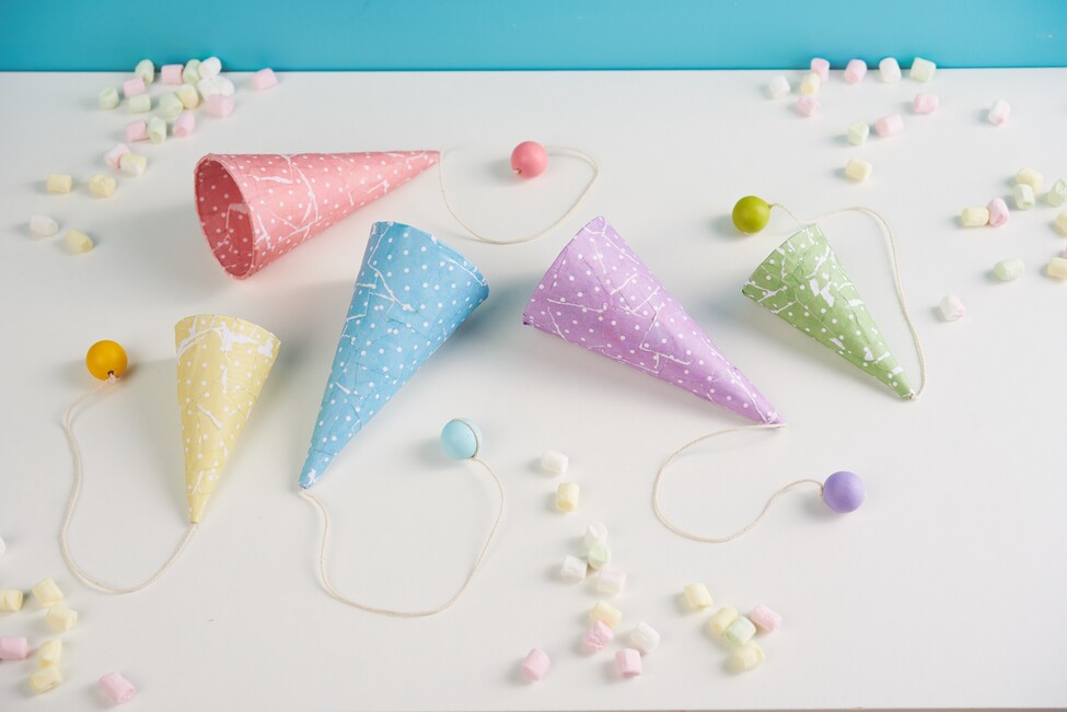 2. Następnie przyklej małe kawałki papieru z pastą do tekturowego stożka, aż przestaną być widoczne i pozostaw do wyschnięcia, aż pasta będzie twarda i całkowicie sucha.
