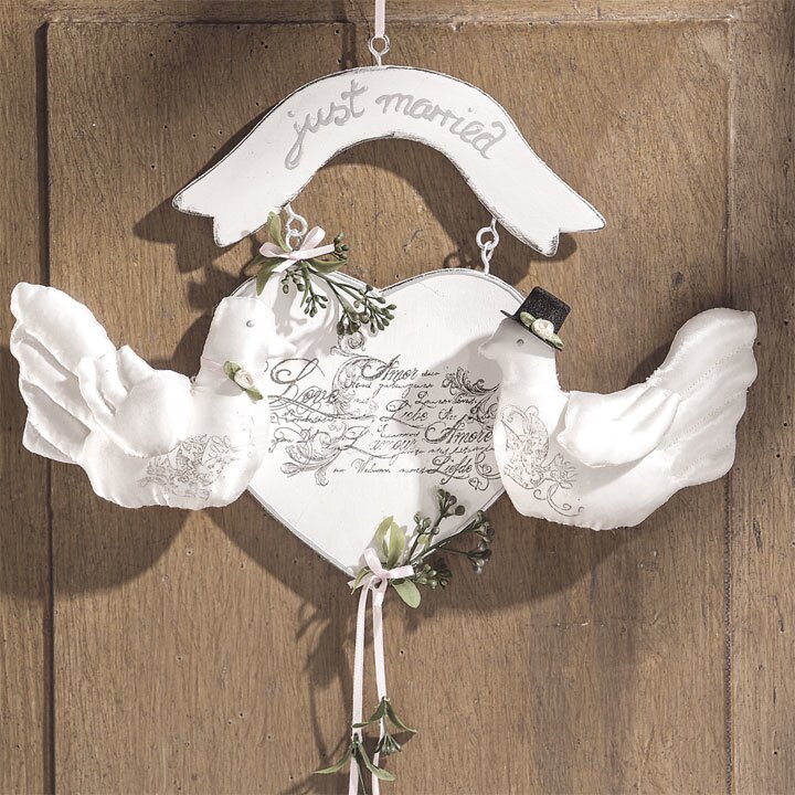 Napisz "just married" na łuku długopisem ex-stroke i obrysuj perłowym pisakiem. Przyklej kawałek kartonu o wymiarach ok. 22 x 3 cm na środku za sercem. Następnie przyklej gołębie po prawej i lewej stronie serca na tekturze. Na koniec przyklej do serca małe gałązki jemioły lub trochę bukszpanu z ogrodu i dodaj małe satynowe kokardki.