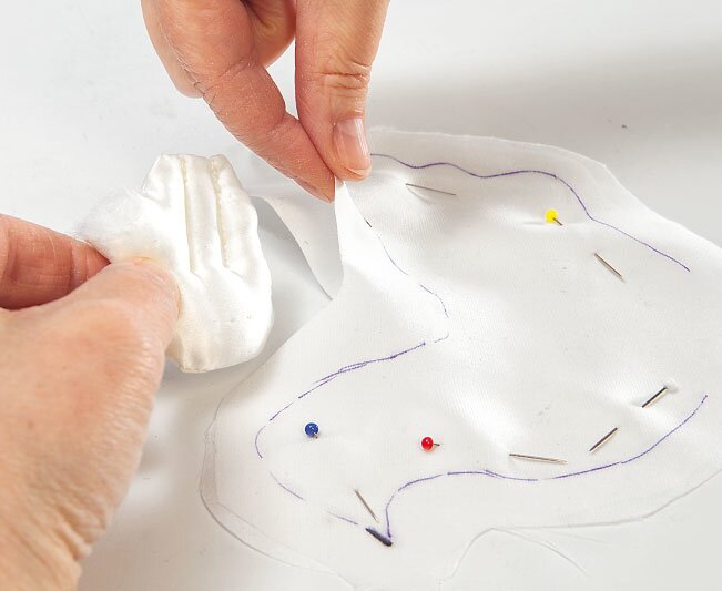Dla każdego gołębia przenieś szablony korpusu i skrzydeł dwukrotnie na jedwab za pomocą flamastra i wytnij z naddatkiem na szew ok. 1 cm. Umieść wszystkie części prawymi stronami do siebie.