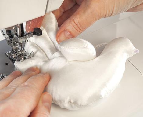 Najpierw zszyj skrzydła z wyjątkiem małego otworu, obróć i wypchaj watoliną. Następnie umieść zaszewki. Umieść gotowe skrzydła między częściami ciała i zepnij je szpilkami. Następnie zszyj korpus z wyjątkiem małego otworu, obróć, wypchaj i umieść zaszewki na ogonie. Zamknij szew ściegiem materacowym.