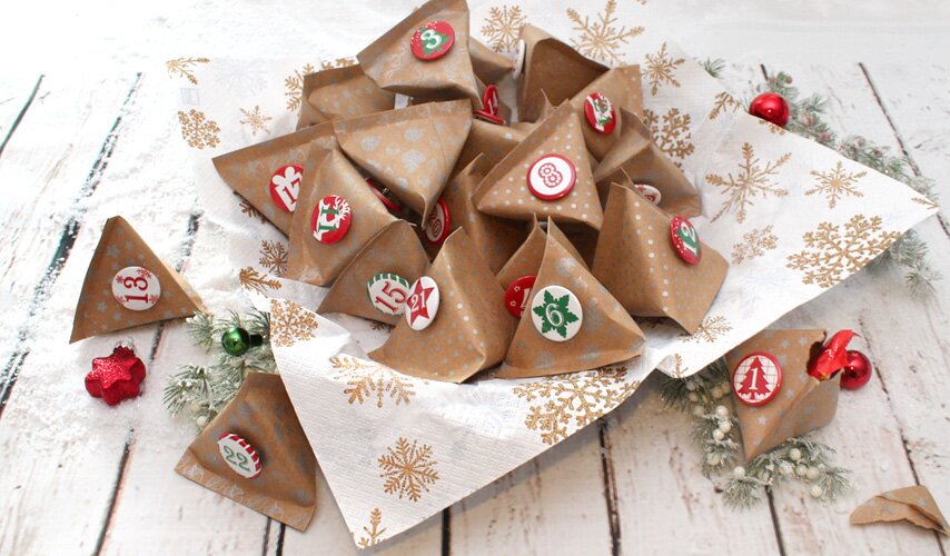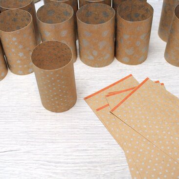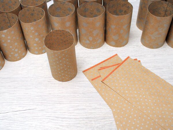 Weź 12 arkuszy papieru i przetnij je na pół, aby uzyskać 24 paski o wymiarach 15 x 7,5 cm. Przymocuj dwustronną taśmę klejącą do krótkiego końca każdego paska, usuń folię ochronną i sklej paski razem, tworząc rolkę. Następnie dociśnij jeden koniec rolki do drugiego. Najlepiej tak, aby krawędź samoprzylepna nie znajdowała się ani dokładnie na krawędzi, ani dokładnie na środku.